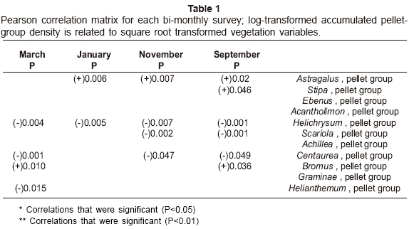 Significant relationships between the pellet-group density and vegetation variables by Pearson correlation matrix are given in Table 1. The results show that pellet-group density showed significant associations with Astragalus in all periods except March, with Stipa in September, with Helichrysum in all periods, with Scariola in September and November, with Centaurea in all periods except January, with Bromus in September and March and with Helianthemum in March.