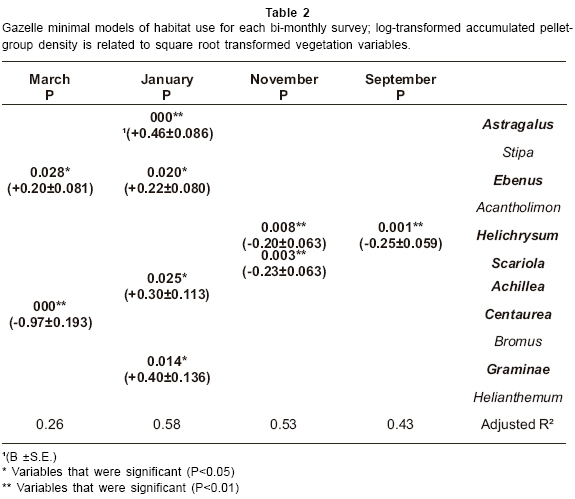 Gazelle minimal models of habitat use are given in Table 2. The results show that gazelle pellet-group density showed significant positive associations with Astragalus, Ebenus, Achillea and Graminae in January and with Ebenus in March. In addition gazelle pellet-group density showed significant negative associations with Helichrysum in September and November, with Scariola in November and with Centaurea in March.