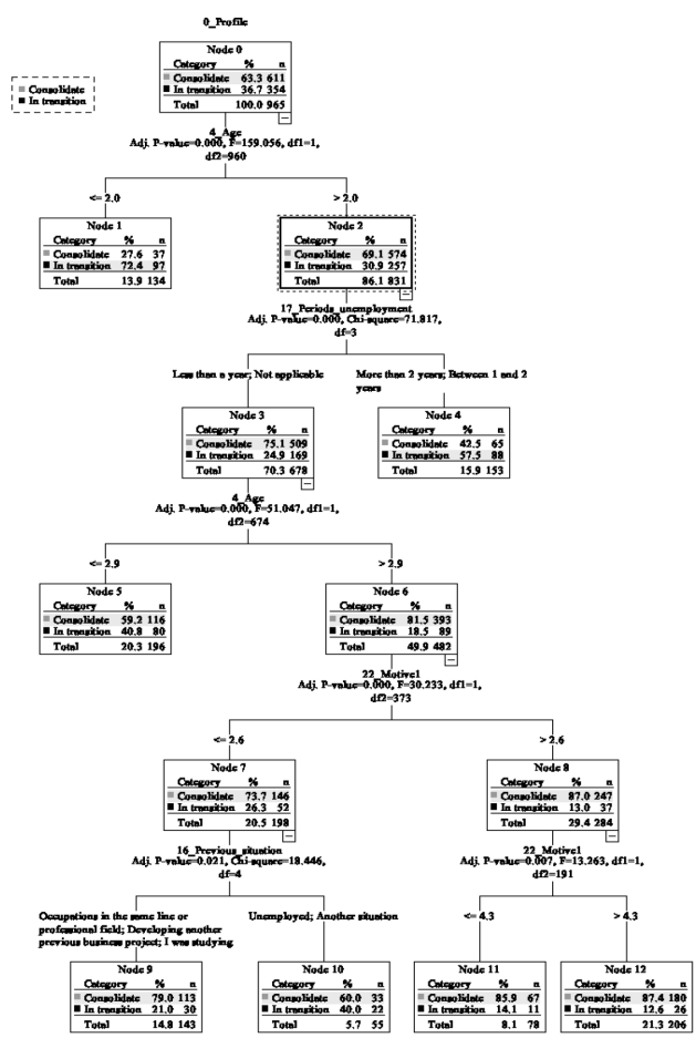 The profile of the consolidated entrepreneur is characterized by being older (< 2.0 = from 41 years old) (node 2) and is more consolidated as the entrepreneur increases in age.