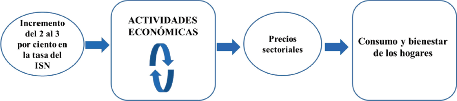 En este contexto, el propósito de este artículo es analizar y cuantificar, mediante un modelo de precios, los impactos del ISN sobre los precios, y los niveles de consumo y bienestar de los hogares nuevoleoneses, en un contexto multisectorial, esto es, considerando la heterogeneidad sectorial y tomando en cuenta las relaciones de compra-venta entre las actividades productivas. En el ejercicio, se asume que el aumento en el ISN se traslada hacia delante, como un incremento en precios, dado que la evidencia para las entidades federativas mexicanas sugiere que el ajuste se da vía salarios reales (Ayala, Chapa y Cabral, 2016) y en parte la reducción en el crecimiento de los salarios reales se puede deber a que las empresas aumentan los precios al consumidor.