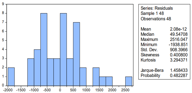 La evaluación del grado de consistencia de los resultados definitivos hallados indica que los parámetros estimados son robustos y eficientes, debido a que no existen problemas de autocorrelación, de heterocedasticidad y de colinealidad (Tabla 3). A su vez, el estadístico Jarque-Bera -estimado mediante el paquete estadístico Eviews 12-, resultó tener un valor de 1.458433 (menor a 5.9), lo cual indica la existencia de una buena bondad de ajuste y que los residuos resultantes de la diferencia entre los valores observados y los estimados de la tasa de infección por coronavirus siguen una distribución normal (Figura 2).