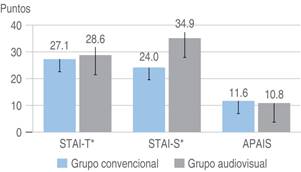 Las puntuaciones de la escala APAIS en los pacientes que recibieron información oral convencional fueron 11.6 ± 4.1 puntos y en los que recibieron información audiovisual fue de 10.8 ± 5.1 puntos (p = 0.541, t de Student). Por otro lado, la puntuación STAI-S media fue 24.0 ± 5.4 puntos en el grupo convencional y 34.9 ± 3.2 en el grupo audiovisual (p < 0.001, t de Student) y la puntuación media STAI-T fue 27.1 ± 2.1 en el grupo convencional y de 28.6 ± 2.6 en el grupo audiovisual (p = 0.013, t de Student) (Figura 1).