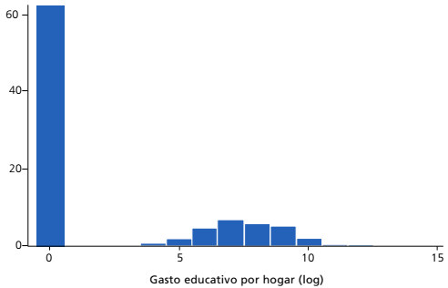 La técnica de estimación de las ecuaciones desarrolladas conforma el segundo paso hacia la construcción de las curvas de Engel. En principio, distintas opciones aparecerían disponibles para ser implementadas con esta finalidad (Blundell, 1999; Li, 2021). Sin embargo, a diferencia de otros bienes y servicios de consumo, los educativos traen consigo dificultades necesarias de ser examinadas. La Figura 1 muestra la distribución de frecuencias del gasto educativo de los hogares parte de la muestra empleada en esta investigación. Con claridad, entre estos, una elevada cantidad de casos se acumula alrededor de inversiones nulas o equivalentes a cero. Concretamente, el inconveniente no refiere a limitaciones producto de la falta de información o por errores de captura. En cambio, se apunta al hecho de que, para muchas viviendas, la adquisición de bienes o servicios educativos fue nula en el trimestre de implementación de la ENIGH 2020 (ver Long, 1997; Long y Freese, 2014).