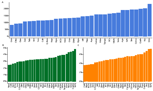 En la Figura 2 el panel A muestra a Querétaro como el estado con el mayor gasto educativo medio, seguido de Nuevo León, Coahuila, y Sinaloa. Mientras tanto, el panel B muestra la proporción media de gastos educativos sobre la inversión total del hogar, revelando que las viviendas entre San Luis Potosí, Coahuila y Querétaro destinaron una mayor parte de sus gastos a bienes y servicios relacionados con la educación. Sin embargo, la medida reportada asigna un peso igual a cada hogar a nivel nacional, a pesar de que aquellos con los ingresos más altos pueden representar una proporción más grande del denominador. Con el objetivo de corregir esta posible distorsión, el panel C presenta el gasto educativo como proporción de los gastos totales de los hogares encuestados. Aunque la interpretación es similar, los resultados son más elevados en todos los estados. Entre aquellos como Querétaro, San Luis Potosí y Nuevo León, la proporción del gasto educativo total por parte de las viviendas, con respecto al gasto total, fue la más alta. La diferencia con estados como Colima, Nayarit y Baja California es de alrededor de 2.4 puntos porcentuales. Sin embargo, en este caso, incluso después de ajustar la estimación, es importante tener precaución con posibles errores relacionados con las disparidades socioeconómicas de origen.