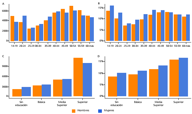Basado en el análisis previo, se calcula la media de gastos educativos por grupo de edad y nivel educativo máximo del jefe del hogar. La Figura 3, paneles A y B, revelan una tendencia sorprendentemente similar: con excepción de grupos de edad iniciales (es decir, familias encabezadas por personas entre 14 y 24 años), los gastos en bienes y servicios educativos se incrementan a medida en que la edad del jefe del hogar aumenta. Sin embargo, una vez que el principal proveedor económico supera los 55 años, la inversión parecería disminuir. En este sentido, es importante destacar que el panel B muestra una tendencia única en la que las mujeres destinan una proporción más elevada de su gasto total a la educación en promedio, lo que es aún más pronunciado entre los grupos de edad más jóvenes. Finalmente, al agrupar lo anterior según el nivel educativo del jefe del hogar, las mediciones resultantes pueden considerarse indicativas del valor que los hogares otorgan a la educación de los miembros inscritos en el sistema educativo mexicano. Si asumimos esta interpretación, y tomamos como base los paneles C y D de la Figura 3, el patrón es claro: cuanto mayor es la educación máxima del proveedor económico principal del hogar, mayor es la cantidad y proporción del gasto total asignado a bienes y servicios educativos.