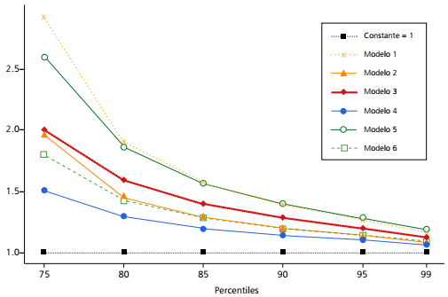 Con base en los cálculos presentados, la Figura 4 utiliza las mismas regresiones con el objetivo de presentar elasticidades del ingreso-gasto, valorada a diferentes puntos de la distribución de la inversión en educación esperada. En general, los coeficientes del ingreso per cápita en escala logarítmica para cada modelo evaluado sugieren un patrón decreciente con tendencia a converger en 1 para los percentiles más elevados. En estricto sentido, los resultados evidencian que en México la educación parecería comportarse como un bien o servicio de lujo incluso para los hogares con ingresos más elevados.