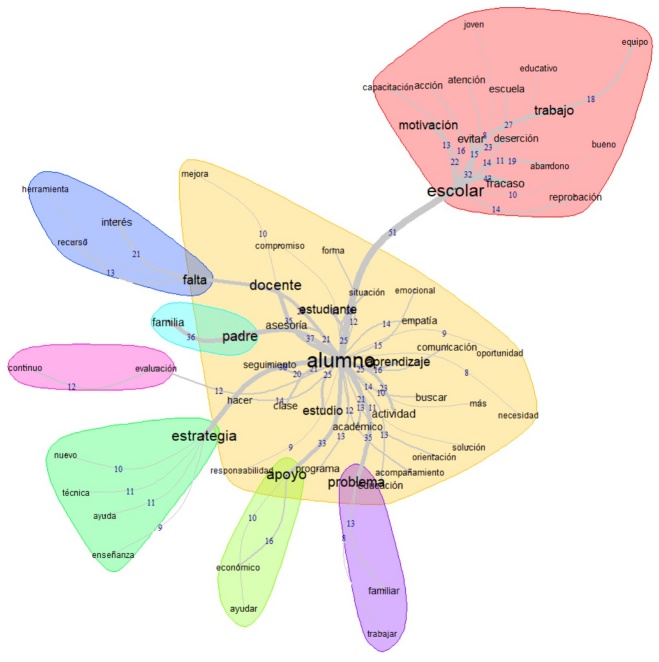 Al profundizar en el análisis del discurso sobre la palabra alumno, podemos identificar otras relaciones de coexistencia con palabras como padre, familia, problema, falta, estudio, entre otras, que robustecen el discurso sobre las características del alumnado. Desde la perspectiva del profesorado, las dificultades en el afrontamiento se asocian a los problemas que experimenta el estudiante en el núcleo familiar donde trabajar es una necesidad, y con la falta de interés, recursos y herramientas para el desarrollo de hábitos y técnicas de estudio. De igual manera, es posible identificar las palabras aprendizaje, estrategia y docente, que fortalecen el discurso del rol que desempeña el profesorado frente al afrontamiento del fracaso escolar. Desde esta lógica, los docentes reconocen la necesidad de diseñar una estrategia de mejora del proceso de enseñanza para favorecer el aprendizaje del alumnado.
