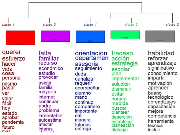 Por su parte, el análisis de clasificación jerárquica identificó dos agrupaciones principales en el discurso del profesorado. La primera incluye el discurso que tiene que ver con las causas del fracaso escolar: la percepción de una cultura del mínimo esfuerzo entre el estudiantado, propuesta desde la institución escolar (clase 1) y el desinterés de los jóvenes por continuar con sus estudios. Esto, originado por un contexto familiar de precariedad económica que produce las condiciones adecuadas para la desvinculación escolar (clase 5). La segunda agrupación comprende el discurso concerniente a las estrategias de afrontamiento al fracaso escolar que reconoce el profesorado; a su vez, esta agrupación discriminó, en un primer momento, el discurso de la formación continua (clase 2) como una estrategia adaptativa que pone en práctica el 73% de los participantes de este estudio. En un segundo momento, el discurso de la necesidad de establecer una estrategia institucional contra el fracaso escolar (clase 3) y el de la canalización al departamento de orientación educativa (clase 4) se vincularon fuertemente. La estrecha asociación de ambos discursos muestra que la estrategia utilizada en mayor medida por el profesorado es la búsqueda de apoyo social, soportado por los sujetos educativos asignados al departamento de tutorías de la institución educativa.