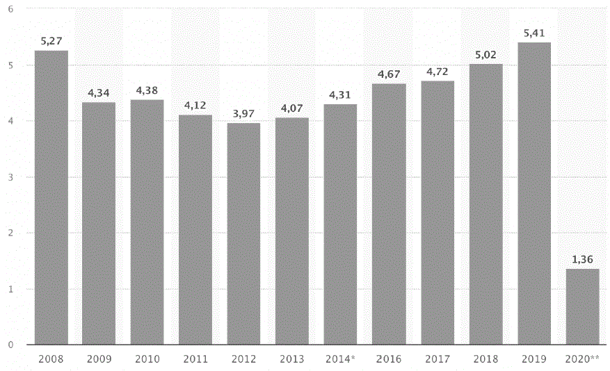 Expectations for the business tourism sector were high in 2019 (Graph 1). World Tourism Organization (UNWTO, 2020) expected growth of 3-4% in 2020; the Middle East region had the fastest-growing region in terms of international tourist arrivals in 2019, almost doubling the global average (+8%). Growth in Asia and the Pacific slowed. Despite this, it had above- average growth, with a 5% increase in international arrivals. Europe, where growth was also lower than in previous years (+4%), was leading in international arrivals, with 743 million international tourists in 2019 (51% of the global market) (UNWTO, 2020).