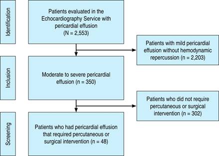 The included patients were adults older than 18 years who entered the emergency department or hospitalization. All patients had an imaging diagnosis of PE and, its severity was defined by echocardiographic quantification performed by an echocardiography cardiologist. The exclusion criteria were the absence of more than 50% of the data in the clinical history and the recurrence of the pericardial effusion after its first drainage. All the patients required some intervention for pericardial fluid drainage; percutaneously in 26 patients and with surgery (pericardial window) other 22.