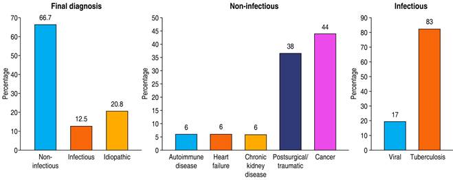 Regarding the etiologies (Figure 2), non-infectious etiologies were the most frequent (66.7%). These included: malignancy (14 cases equivalent to 43.8% of non-infectious causes), postoperative or traumatic (12 cases, 37.5%), chronic kidney disease (2 cases, 6.2%), heart failure (2 cases, 6.2%) and autoimmune disease (2 cases, 6.2%). In 20.8% of the cases, it was not possible to establish a clear underlying cause, therefore, they were established as idiopathic PE or idiopathic pericarditis. Infectious etiologies were the least common (6 cases, 12.5%). Among these, pericardial tuberculosis was the cause in 5 of the 6 cases (83.3%).