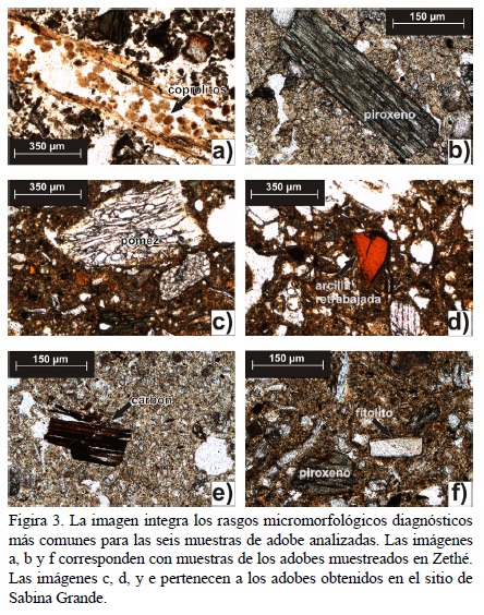 El análisis micromorfológico mostró que, no obstante que el adobe es un material tecnogénico, al que se le adicionaron diferentes componentes orgánicos e inorgánicos, aún sigue presentando evidencias de procesos de alteración que son propias de un suelo.