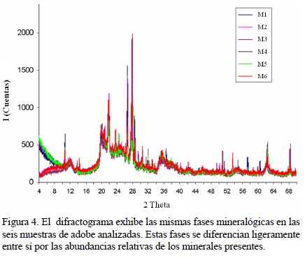 Difracción de rayos X. Los difractogramas se obtuvieron en un difractómetro Shimadzu XRD-6000 equipado con filtro de Ni, tubo de cobre y monocromador. Las seis muestras de adobe se analizaron como roca total en fracción no orientada. El procedimiento utilizado se describe brevemente a continuación.