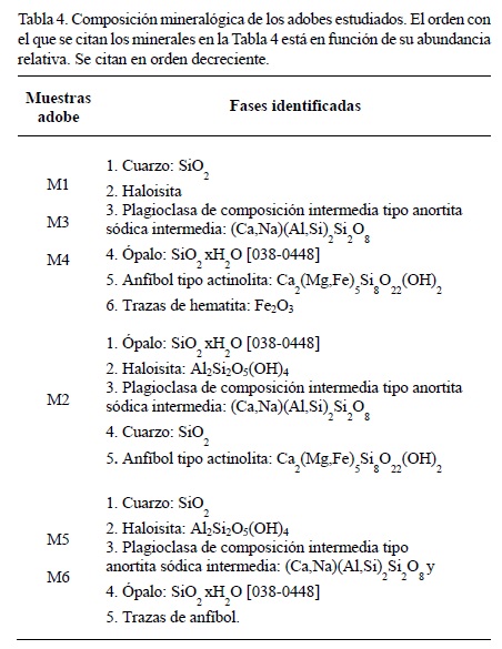 De acuerdo con la clasificación sedimentaria de los ópalos se puede considerar que el ópalo que se presenta en las muestras de adobe son de tipo CT con predominio de picos de cristobalita y en menor proporción de tridimita; y