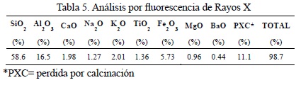 Fluorescencia de rayos X. Como se observa en la Tabla 5, la composición química total de la muestra M4 es intermedia. En dicha muestra se infiere que los elementos alcalinos, la sílice y el aluminio, son constituyentes importantes de las plagioclasas, vidrio volcánico y en menor proporción de las zeolitas silícicas y arcillas de tipo haloisita. También se infiere lo siguiente: