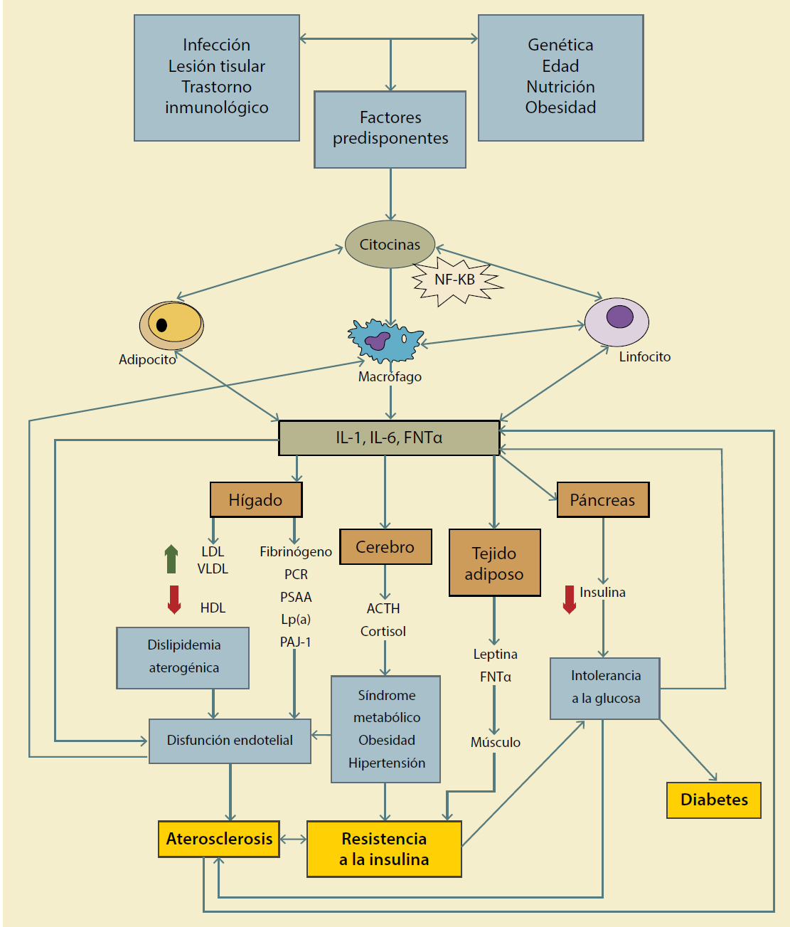 Los adipocitos sobreestimulados como consecuencia de la resistencia a la insulina liberan otras citocinas que desencadenan y pueden complicar la respuesta inflamatoria, igualmente puede promover la adherencia de los monocitos a las células endotelíales, generando un evento de ateroesclerosis, y favoreciendo la actividad fagocítica de los macrófagos.