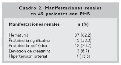 La afección renal es la complicación más frecuente y potencialmente más grave de la PHS, se presenta en 20 a 49% de los pacientes.5,6 Las manifestaciones renales incluyen hematuria, proteinuria, síndrome nefrítico, síndrome nefrótico y síndrome nefróticonefrítico; generalmente aparecen en las primeras cuatro semanas del inicio de la PHS y rara vez preceden a la aparición de las lesiones dérmicas.7 Algunos pacientes pueden tener manifestaciones de nefritis hasta un año después de la púrpura.8