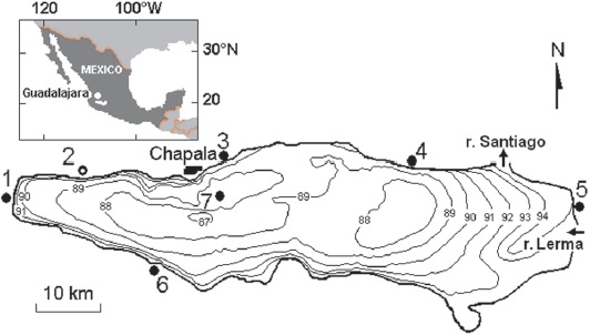 Figure 1 Bathymetric map of Lake Chapala. Depth is given in meters in relation to the 87 m isobaths. Arabic numerals sites meteorological stations are shown: 1- Jocotepec, 2 - Atequiza, 3 - Chapala, 4 - Poncitlán, 5 - Jamay, 6 - Tizapán and 7- Isla de Alacranes.