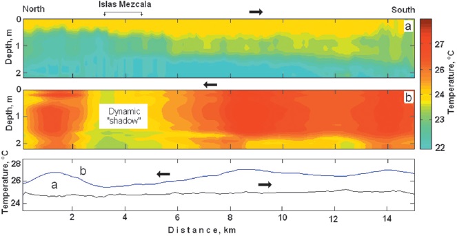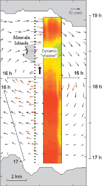 A zone of strong vertical mixing was discovered on the last leg, about 1 kilometer east from the Mezcala Islands, when the array of the recorders was towed from the south to the north. These islands are about 1.5km long. They are perpendicular to the flow of the gyre and create dynamic shadows (the shaded area in Figure 10). Within this area, the upwelling of cold bottom water due to the Bernoulli effect resulted in its mixing with the warm surface water. Unfortunately, the spatial grid of the model (300x300 m) was too coarse to simulate this effect.