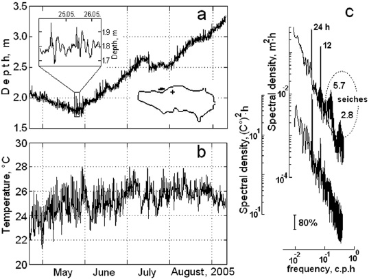 Figure 2 (a) Hourly fluctuations of lake level and (b) temperature fluctuations at a mooring during the experiment in the summer 2005. (c) Frequency spectra of a level and temperature fluctuations. Arabic numerals showing the period of the main peaks in the spectrum. The vertical line shows the 80% confidence interval.