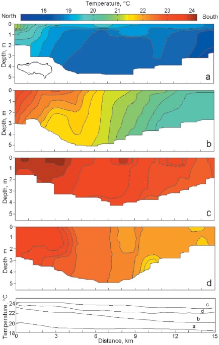 It is seen from the Figure that the in situ measurements confirm the previous finding, namely that in all seasons the temperature in the central and northern parts of the lake is higher than in the southern part. This holds true not only for the surface but also for the bottom layer. In all four seasons, vertically-averaged temperatures at the north and south ends of the cross-section differ by 2-3 °C. The vertical distributions of temperature on the sections are uneven.