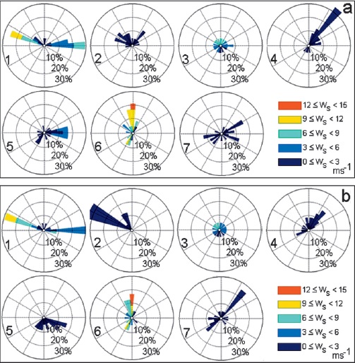 Figure 4 Annual wind rose at meteorological stations around the lake: a) for the dry season; b) for the wet season. The data was averaged for 2006-2007.