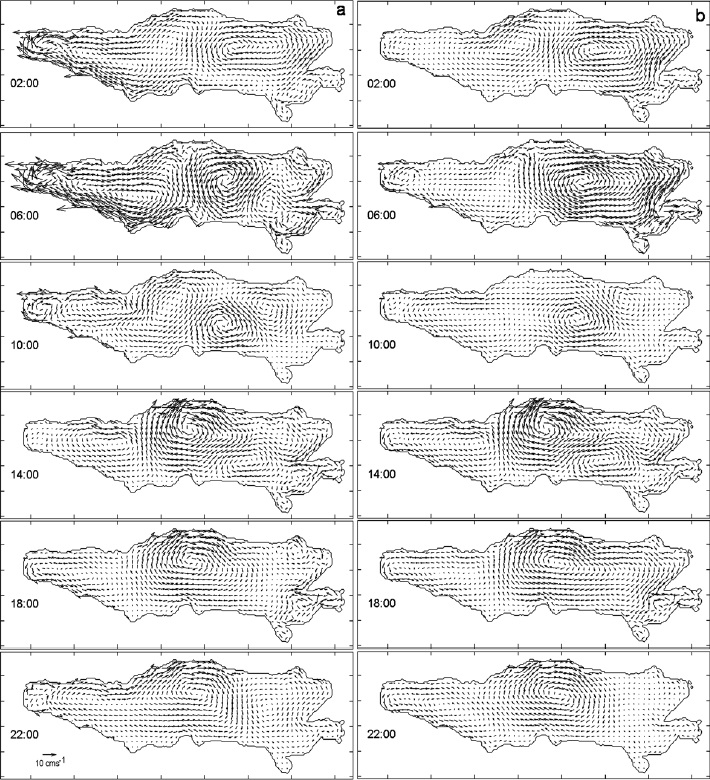 The model results are shown in Figure 5 as vector plots of current fields at 4-hour intervals. The breeze-induced circulation pattern in the lake is represented by two gyres. One of them is cyclonic (counterclockwise rotation) and located in the east-central part of the lake. The other gyre is anticyclonic (clockwise rotation) and located in the west-central part. The model results exhibit a very complex dynamics, whose small-scale features are difficult to interpret. Nevertheless, similar gyres were identified near the east and west coast.