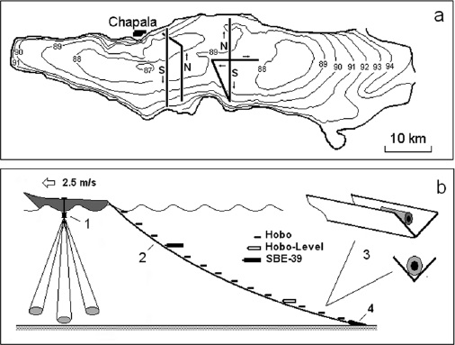 Figure 6 a) General scheme of experiments on Lake Chapala conducted on January 10, 2007 (polygon Alacranes left of the center of the figure) and June 1, 2014 (polygon Mezcala, in the center of the figure). b) Scheme of the towed sensor system. 1600 kHz RDI ADCP, 2 - Metallic angular pattern in which fixed thermographs, 3 - thermograph's mount, 4 - lattices for deep penetration of the chains.