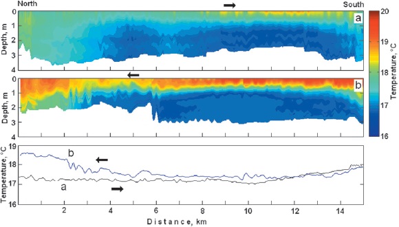 The measurements were taken in the morning (from 7:00 to 9:00 am), so that the temperature along the cross-section was not biased. The cross-section extends from the northern coast (near the town of Chapala) to the south side of the lake. The spatial distribution of temperature at the cross-section is shown in Figure 3.