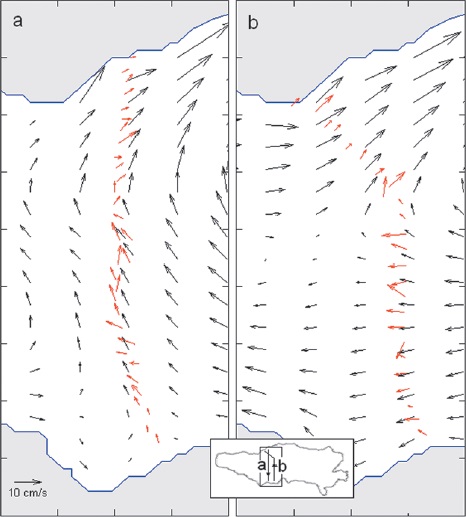 Figure 8 (a) Modeled currents (black vectors) versus currents observed (red vectors) in the area of the S transect sampling, and for N transect. The experiment was conducted on January 10, 2007, the simulations were at 12:30 and 19:00, respectively.