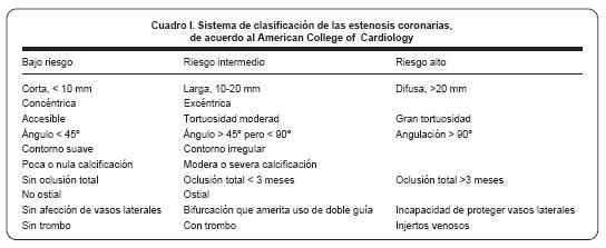 Una vez efectuada la coronariografía, el cardiólogo intervencionista está en posición de evaluarel riesgo de una ICP. De una manera muy general las consideramos de bajo, moderado y alto riesgo (Cuadro I), desde luego entran en juego otros factores como son el estado general del paciente, la función renal, un volumen circulatorio óptimo y un estado electrolítico apropiado y la presencia o no de otras comorbilidades.