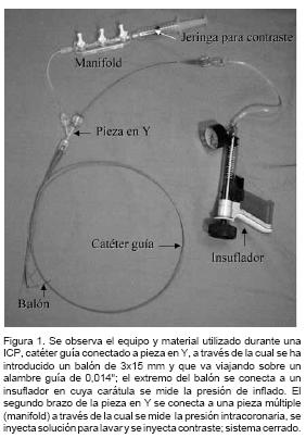 Se usa un introductor arterial generalmente de 6F y se recurre al usode catéteres guías de punta suave de 6F para el sondaje selectivo de la arteria diana. Éste catéter está conectado a una pieza en Yque sirve para inyectar contraste y medir continuamente la presión intracoronaria y por el otro extremo se introducen los implementos (alambre guía, balones y stents) que ayudarán a realizar el PCI (Figura 1).