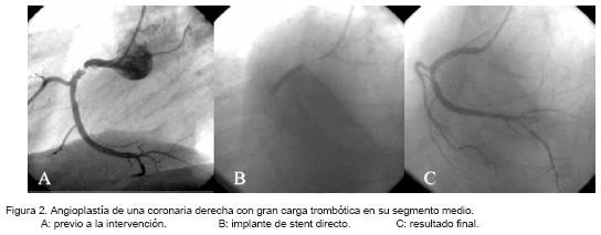 Bajo control fluoroscópico y mediante la inyección de medio de contraste se visualiza la lesión diana, una vez localizada la mejor proyección angiográfica para trabajar, se cruza el alambre guía, que tiene usualmente un diámetro de 0,014" (0,36 mm) a través de la arteria coronaria y se cruza el sitio de la estenosis, el alambre guía debe posicionarse en la parte más distal del vaso a tratar para dar el mejor soporte posible. La estenosis puede predilatarse con un balón o se dilata directamente al implantarel stent, esta decisión la toma el cardiólogo intervencionista tomando en cuenta numerosos factores. Es importante señalarque durante el inflado ya sea del balón o del stent, se está ocasionando una oclusión transitoria pero completa del vaso, generalmente por lapsos de 30 a 60 segundos, pero que en ocasiones son suficientes para ocasionar problemas hemodinámicos, angina, cambios electrocardiográficos y arritmias (Figura 2).