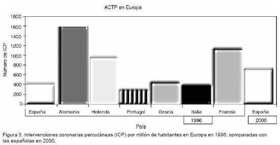 Sólo por poner un ejemplo en el registro español de intervenciones coronarias durante el 2002 se informa de la realización de 34 723 ICP, contabilizadas en 95 centros con actividad en adultos.47 De las ICP realizadas, 4766 (13,7%) fueron en el contexto de infarto agudo del miocardio (ACTP primaria). En el RNCIP se informaron 150 ACTP primarias (28% de las ICP). Para poner en contexto estos datos en cuanto a la actividad intervensionista mundial, la media europea de ACTP por millón de habitantes en 1996 era de 599, en ese año España estaba por debajo de la media con 380 ICP por millón de habitantes, para el año 2000 se incrementó en 671 por millón de habitantes48 (Figura 3).