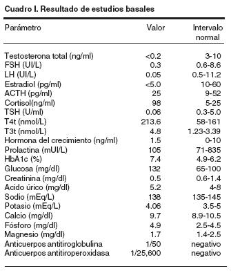 Hombre de 32 años, estudiado desde su nacimiento por micropene y criptorquidia bilateral. Durante la infancia tardía presentó ginecomastia y hasta la actualidad ausencia de caracteres sexuales secundarios tales como vello axilar, púbico y facial, voz aguda, escaso desarrollo de masa muscular y ausencia de erecciones nocturnas. Cariotipo 46 XY. El desarrollo psicomotor fue adecuado. Su crecimiento en la infancia fue normal, aunque su edad ósea se encontraba retrasada. Presenta hábitus eunucoide con estatura de 1.60 m y brazada de 1.70 m, relación de segmentos superior/inferior de .96, peso de 71.5 kg, índice de masa corporal de 26 kg/m2, olfación normal, filtrum largo, cuello corto con acantosis nigricans y distribución ginecoide de la grasa corporal. En región genital se detectó ausencia de vello púbico, con micropene de 2 cm de longitud en flacidez y escroto pigmentado. A la palpación presentó ausencia de testículos en bolsas escrotales y canales inguinales sin tumoraciones. Tanner púbico II, extremidades con acortamiento bilateral de 4° y 5° metacarpianos en ambas manos.