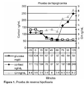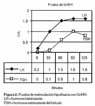 Fue estudiado en el Departamento de Biología de la Reproducción del Instituto Nacional de Ciencias Médicas y Nutrición Salvador Zubirán por la posibilidad de síndrome de Kallman. Se cuantificó testosterona y gonadotropinas en suero, corroborando el diagnóstico de hipogonadismo hipogonadotrópico (Cuadro I), por lo que se procedió a realizar prueba de reserva hipofisaria con insulina regular a dosis de 0.1 U/kg en bolo intravenoso (iv) (Figura 1) y prueba de estimulación con GnRH (hormona liberadora de gonadotropinas) a dosis de 100 µg en bolo por vía iv (Figura 2), encontrándose integridad del gonadotropo y del resto de los ejes hipotálamohipofisarios.