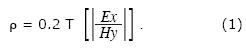 It shows the possibility of obtaining the electrical resistivity of the ground by the measurement of perpendicular telluric and magnetic components at period T (Vozoff, 1972). According to the skin effect, the greater the period, the greater the depth of penetration (p) of the electromagnetic field,