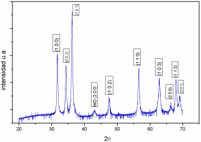 The powder XRD pattern of Zn 1−𝑥 Ni 𝑥 O (𝑥=0.05) sample is shown in Fig. 1. The XRD analysis reveals that this sample exhibits the wurtzite structure that is known ZnO structure. This result confirms that the ZnO wurzite structure has not been modified with the Ni-doping. An reflection (200) of NiO crystalline structure was detected, indicating that Ni-doped ZnO was formed along with NiO phase. The lattice parameter obtained by the program NBS-L gives: 𝑎=3.250 (6) Å, 𝑐=5.200 (2) Å, values very closed to previous reported values7,8,9.