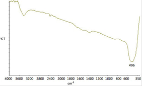 Infrared transmittance spectra were employed to study that vibration bands due to Zn-O bond and the changes due to Ni substitution in its structure. The absorption band observed at 496 cm −1 is attributed to the stretching mode of Zn-O in the tetrahedral coordination. Two more significant bands are at 3570 cm −1 and 2400 cm −1 , the first one could be assigned to O-H vibration modes, and the second to absorption energy by the bonding in CO 2 molecules10,11. Some others bands at around 3000 cm −1 and 1500 cm −1 could correspond to asymmetric and symmetric to C=O stretching modes12.