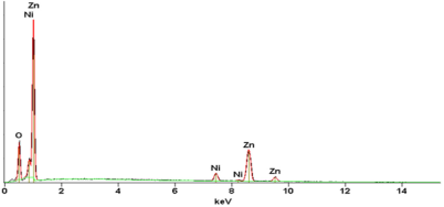 The EDS analysis of Ni doped ZnO it was carried out to establish purity of the sample and confirm presence of Ni. The observed EDS pattern is shown in Fig. 3. It is noticed that the sample prepared contain only Zn, Ni and O. Thus the nanocrystals are found to contain no spurious contamination. The ratio of the atomic percentage of the elements present in the sample complies with the quantity taken for their synthesis.