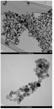 In order to learn more about the microstructure of Ni doped ZnO prepared by sol-gel autocombustion, transmission electron microscopy was done. TEM bright field images of Ni doped ZnO are shown in Fig. 4(a) it can be seen that the nanoparticles are rounded, presenting some degree of agglomeration due to the dipole-dipole interactions. In Fig. 4(b) it is possible to see nanoparticles of undoped ZnO. The shape looks also to be rounded. Grain size distribution was estimated using the program IMAQ-vision builder and characterized by a distribution Log Normal type (solid line) in Fig. 4(a) with an average grain size of 31 nm and standard deviation of about 35%. For the sample undoped ZnO the obtained average size was 26 nm.