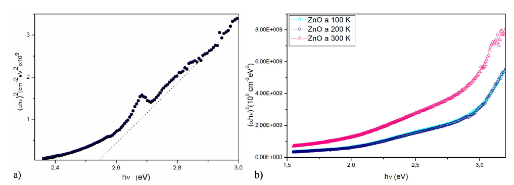 Exponent 𝑛 depends on the type of transition and it may have values of 1/2, 2, 3/2 and 3 corresponding to the allowed direct, allowed indirect, forbidden direct and forbidden indirect transitions respectively14. The room temperature spectra (𝛼ℎ𝜈) 2 vs. photon energy (ℎ𝜈) of the Ni doped ZnO nanoparticles presented in Fig. 6(a) could be compared to the spectrum obtained for the undoped ZnO reference sample 6(b). The value of band gap was determined by extrapolating the straight line portion of (𝛼ℎ𝜈) 2 = 0 axis, as shown in Fig. 6. The obtained band gap for the doped ZnO is about 2.54 eV while Fig. 6(b) shows the band gap value for undoped ZnO, 2.76 eV for R.T.