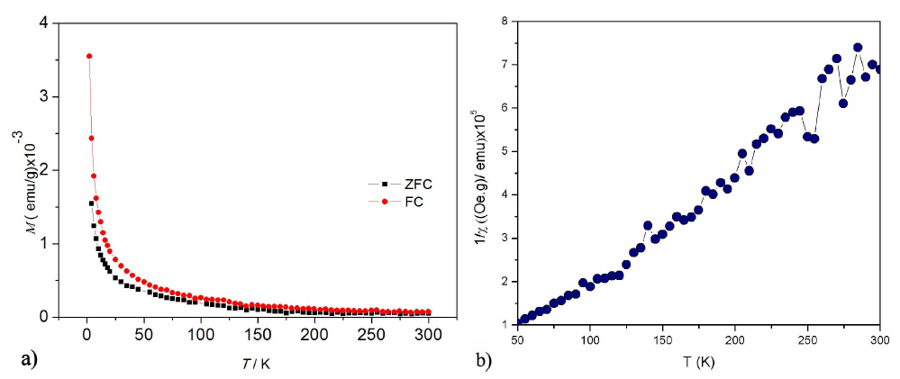 Figure 7 (a) The temperature dependence of magnetization at a field of 50 Oe and (b) The reciprocal magnetic susceptibility Vs. Temperature for the Zn0:95Ni0:05O.