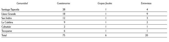 El estudio se realizó en el segundo semestre de 2014 como parte de un proceso de apoyo a la operación de la Comisión Municipal de Salud (Comunsal) de Santiago Tapextla, con participación de diversos actores locales y del gobierno municipal, explorando el potencial sanitario de saberes y recursos locales y la deliberación dialógica de iniciativas sobre problemas de salud (Proyecto Conacyt 101990). El protocolo de investigación fue aprobado en términos éticos por la Coordinación Nacional de Antropología del INAH, y se obtuvo el consentimiento informado por parte de los participantes. Se aplicó un cuestionario sobre dinámicas de empeño-endeudamiento a 75 madres de familia de entre 18 y 60 años, integrantes del programa Prospera y todas adscritas al Seguro Popular en las agencias y la cabecera municipal, 20 entrevistas a profundidad y seis reuniones de grupos focales (cuadros I y II). El criterio de selección e inclusión para aplicar el cuestionario, las entrevistas y para formar grupos focales fue su adscripción a dichos programas y su anuencia para participar. El tema también fue abordado por la Comunsal y en su Boletín de abril de 2015, participando personal médico e integrantes del cabildo.