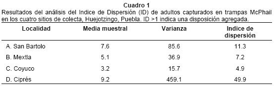 El porcentaje de capturas registradas en cada trampa fue muy variable, puesto que en una misma localidad se presentaron trampas que no capturaron ningún individuo, en tanto que otras capturaron las mayores proporciones. En San Bartolo la trampa A9 registró el 25% de capturas; en Mextla, la trampa B24 registró el 30%; en Coyuco la trampa C44 poco más del 30%; y en Ciprés la trampa D64 registró casi el 60% de las capturas (Fig. 4). Con base en la captura de las trampas, se analizó la distribución espacial de los individuos en cada localidad, calculando el índice de dispersión. Estos resultados indicaron que existe una fuerte agregación en todos los sitios estudiados (Cuadro 1).