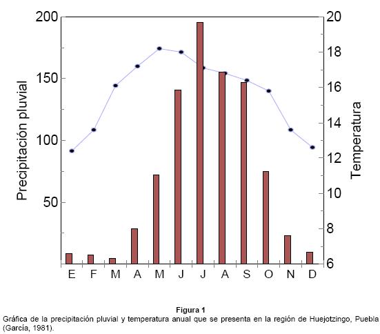 Región de estudio. El estudio se llevó a cabo en el municipio de Huejotzingo, en el Oeste de Puebla, Mexico, localizado en las cercanías del Volcán Popocatépetl (19°14' 19°16'N; 98°20' - 98°38' W) a una elevación de 2,260 m sobre el nivel del mar (INEGI 1993). Las comunidades de vegetación nativa de la región han sido reemplazadas en su mayoría por cultivos en los valles, pero en las zonas montañosas, se presentan bosques de Pino-Encino asociados con vegetación arbustiva, entre las especies dominantes se encuentran Pinus montezumae, P. teocote y P. oocarpa, además de algunas especies de encinos como Quercus laurina y Q. affinis (Soto & Aguiar 1969). El clima de la zona es templado subhúmedo con estación lluviosa en el verano entre abril y octubre (García 1981), con una temperatura anual promedio de 15.7°C, y una precipitación pluvial anual de 868.2 mm; la temperatura varía de 12.4°C en enero hasta 18.2°C en mayo, en tanto que la precipitación mínima es de 4.9 mm en marzo, y la máxima de 195.6 mm durante julio (Fig. 1). La localidad de estudio incluye huertos mixtos compuestos principalmente de tejocote (Crataegus mexicana), nogal (Juglans mollis) y capulín (Prunus serotina), además de algunos árboles de manzana (Malus domestica).