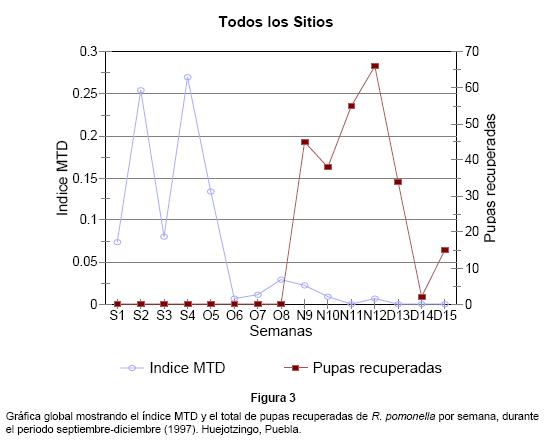 Revisión de frutos. Para evaluar los niveles de infestación natural en cada sitio, adicionalmente se recolectaron muestras semanales de frutos maduros tanto del árbol como del suelo dependiendo de su disponibilidad. Durante las primeras seis semanas del estudio, la disponibilidad de frutos maduros fue prácticamente nula; a partir del 3 de noviembre (semana N9) alrededor del 50% de los frutos presentaron una coloración amarilla y se consideró como su estado de madurez. Desde esa fecha hasta el final del estudio se recolectaron semanalmente 60 frutos maduros, seleccionados principalmente de cuatro árboles en donde se colocaron trampas en cada sitio, haciendo un total de 420 frutos por sitio, y obteniendo un total de 1,680 frutos para los cuatro sitios durante el estudio. Los frutos fueron colocados en recipientes de plástico con arena como sustrato de pupación y se mantuvieron en condiciones medioambientales de alrededor de 20-24° C. El número de pupas recuperadas se contabilizó semanalmente para cada uno de los sitios.