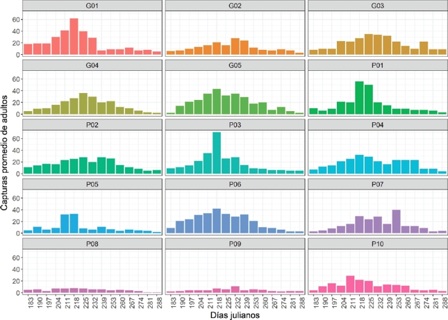 En el caso del tiempo de muestreo, la Figura 8 muestra las fechas y su relación con los adultos capturados, allí se observa una fluctuación esencialmente unimodal, siendo el pico de mayor captura el día juliano 218 (6 de agosto) con más de 15 adultos promedio por captura por trampa. En general, las densidades más altas ocurrieron entre los días julianos 204 (23 de junio) al 239 (27 de agosto); no obstante, el análisis estadístico no indicó un efecto significativo.