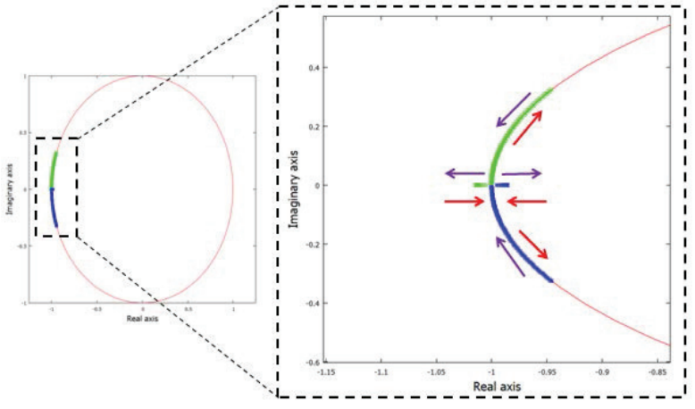 Figure 5 (c) shows the behavior of the eigenvalues at the third bifurcation. The characteristic multipliers start in the imaginary plane and move until they collide on the negative real axis and start to reach only real values on the negative axis. Thus, the eigenvalues indicate a period-doubling bifurcation.