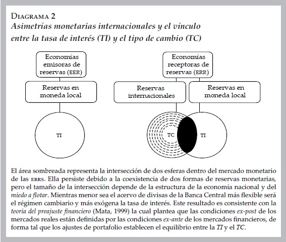 En este sentido, el sistema monetario internacional es asimétrico, ya que en las economías emisoras de reservas ninguno de estos dos efectos es significativo.8 Al no existir la necesidad de mantener un acervo mínimo de divisas extranjeras, la Banca Central de esas economías puede dedicarse a acomodar elásticamente la demanda de reservas en moneda local.9 En ese caso, tanto el dinero base como el crédito privado interno fungen como medio de pago internacional. De allí que las autoridades monetarias de las economías emisoras disfruten de un mayor grado de control sobre la tasa de interés.
